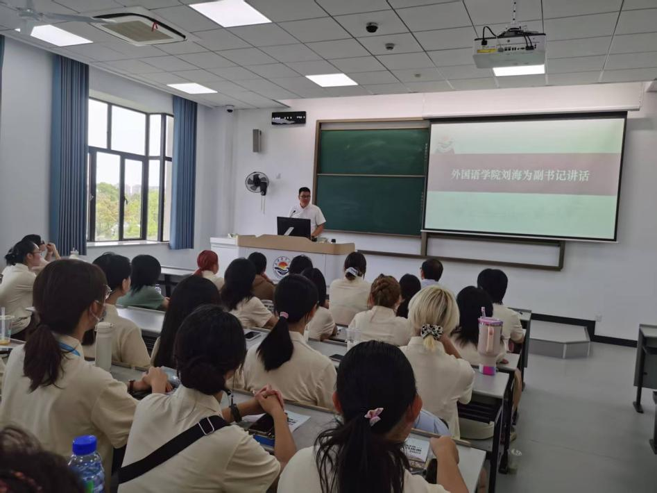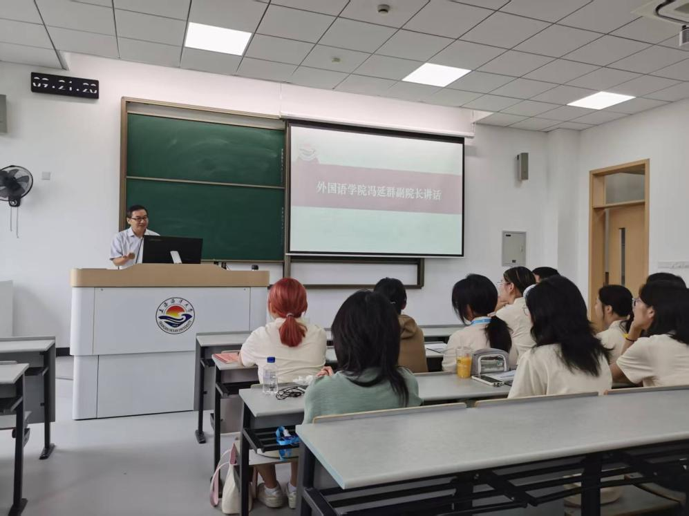 会上,刘海为副书记向同学们系统介绍了学校的各项重要规章制度、学院给同学们提供的各种平台、系部的国际交换项目等,让同学们充分了解了学院和本专业的优势。接着,冯延群副院长从既是领导又是家长的角度,对同学们提出了殷切期望:不要因为社会上对外语专业的不正确看法而动摇学习的决心,要好好利用四年的青春,为自己的未来铺路。随后,邹磊磊老师向大家介绍了英语专业的基本情况,包括历史、师资配备、软硬件设施等。之后,施清婧副系主任给大家播放了2025届优秀毕业生代表,保研北外的蒋丽婷学姐和保研南师大的李青云学姐特意抽空给大家录制的寄语。视频里,蒋丽婷学姐从生活到学业,把自己的经验和盘托出;而李青云学姐则主要从AI改变生活、改变外语学科的角度告诉大家以后的学习该如何定位。两位的讲话给新生以极大的启发。最后,见面会在热烈的掌声中结束。