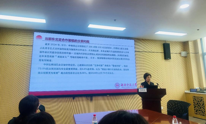蔡美花是湖南师范大学“潇湘学者”特聘教授、东北亚研究中心主任,二级教授,国务院学位委员会学科评议组第六、七届成员,国家首届教学名师。讲座中,她以深厚的学术积淀,从新文科建设的时代背景出发,系统阐释了文化认同在推动东北亚区域合作中的核心价值。通过梳理东北亚各国在地缘政治经济、语言文化、价值观念等方面的深厚历史渊源,揭示了共享文化记忆对构建区域认同的重要作用。蔡美花提出,在全球格局深刻变革的今天,单一学科视角已难以应对复杂的区域问题。外语学科应当主动对接国家战略需求,在尊重文化多样性的基础上,着力挖掘东北亚区域共同文化价值,深化教育、学术合作和青年交流,为区域可持续发展筑牢人文根基。