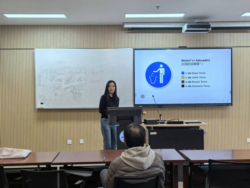 本次演练中,高瑀晗老师以德国社会热点德国垃圾侦探(Mülldetektive)现象为切入点,创新性地将语言教学与公共治理议题深度融合,在真实语言情境中引导学生精准把握德语情态动词表达社会规范时的功能差异。课堂聚焦德语中表义务与禁止的核心情态结构,重点解析müssen与nicht dürfen在规则性语境中的实际应用逻辑,通过典型情境辨析、案例互动研讨等方式,助力学生清晰界定“不同语义层次,充分彰显了鲜明的语言功能导向与任务驱动教学理念。
