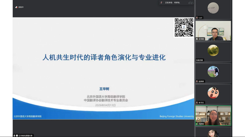 4月13日晚,在数字化转型与人工智能飞速发展的时代背景下上海海洋大学外国语学院特邀北京外国语大学高级翻译学院教授、博士生导师王华树教授担任主讲嘉宾作专题学术报告本次讲座以人机共生时代的译者角色演化与专业进化为题,从翻译主体性与价值理性的双重维度切入,重新审视HITLHuman-in-the-Loop)框架下译者的角色定位与不可替代的人文底色,帮助译者在人机共生的新常态中建立清醒、客观的技术认知,进而积极探索专业素养的深化路径与翻译实践的创新边界。讲座由外国语学院副院长何妤如主持,翻译专业、外国语言文学专业导师和研究生共十余人在线参与。