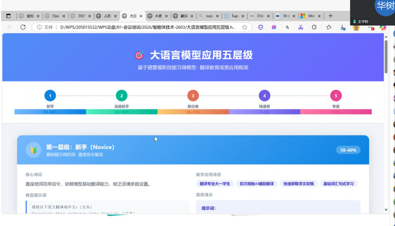 针对大语言模型的应用能力,王华树进一步提出从“新手”到“专家”的五层级模型(认知改变、应用层、整合、构建工作流、批判性反思),并借用许渊冲诗歌翻译“三美”原则,演示如何通过精细化提示词引导大模型完成文学翻译并生成自我反思报告。他还结合SuperCLUE通用榜、OpenClaw等评测数据,分析了主流大模型的性能差异,提醒师生警惕技术工具的幻觉风险、数据安全隐患及单一算法依赖陷阱,强调译者必须保持批判性认知,坚守人文底色。最后,王华树以“拥抱变革,驾驭技术,坚守人文”寄语与会师生,鼓励大家积极探索专业素养的深化路径与翻译实践的创新边界。